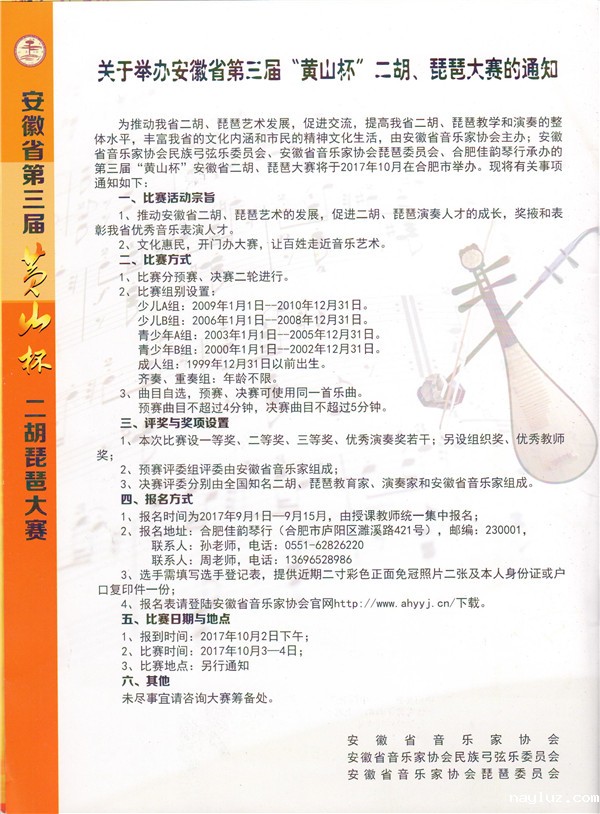 为推动二胡、琵琶艺术发展,促进交流,提高二胡、琵琶教学和演奏的整体水平,丰富我省的文化内涵和市民的精神文化生活,由18luck吧主办,18luck吧民族弓弦乐委员会、18luck吧琵琶委员会、合肥佳韵琴行共同承办的安徽省第三届“黄山杯”二胡、琵琶大赛于2017年10月4日下午在合肥望江宾馆圆满落下帷幕。
