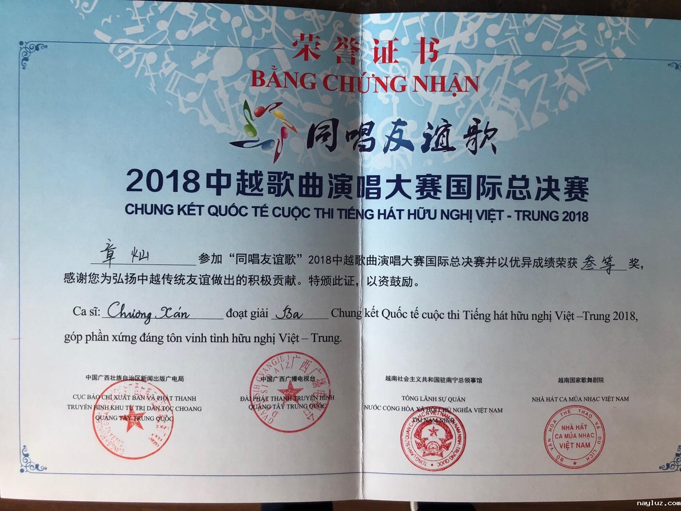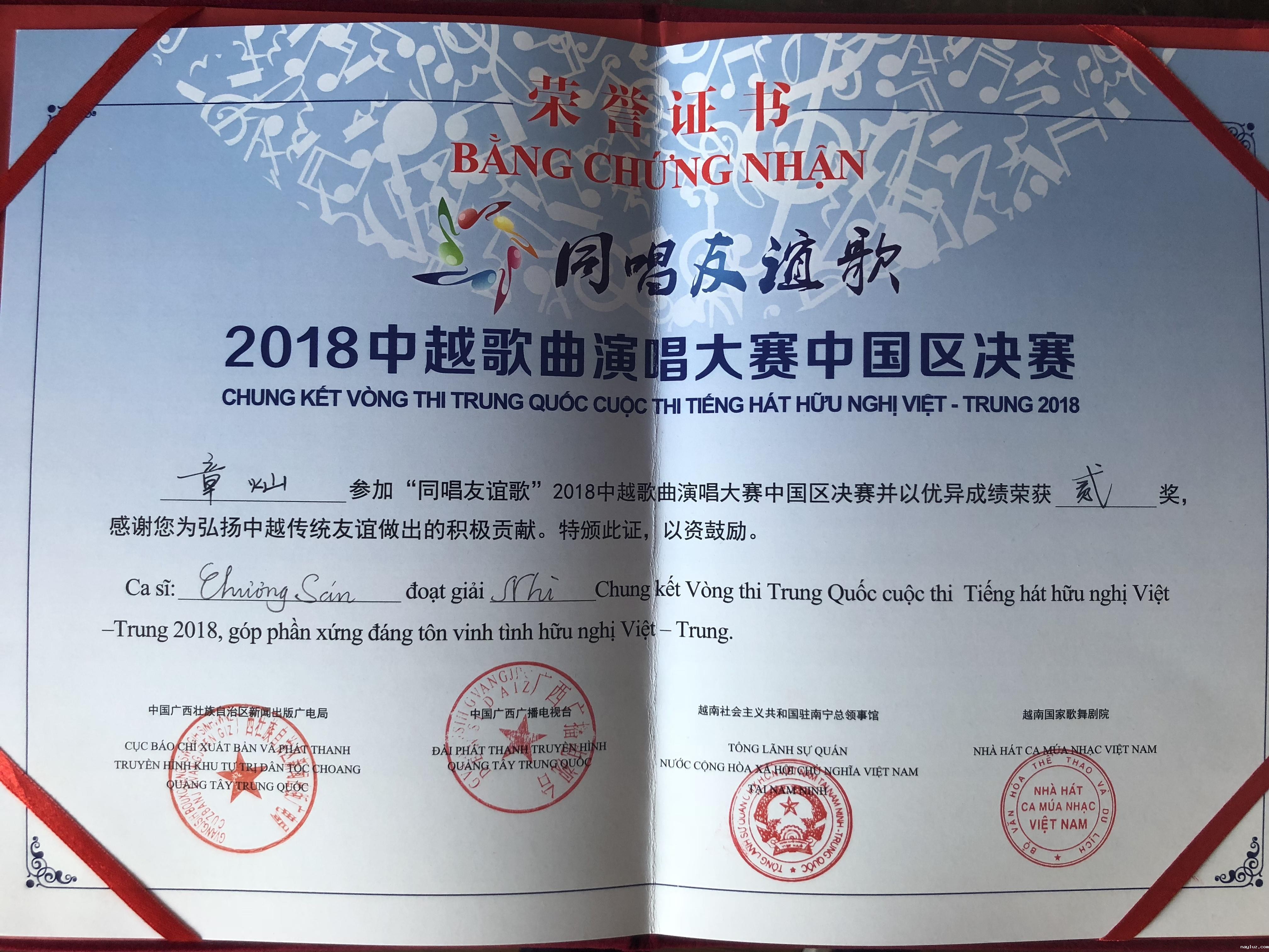 “同唱友谊歌”2018中越歌曲演唱大赛于2018年11月28日在广西南宁举行国际总决赛。安徽选手章灿荣获三等奖。