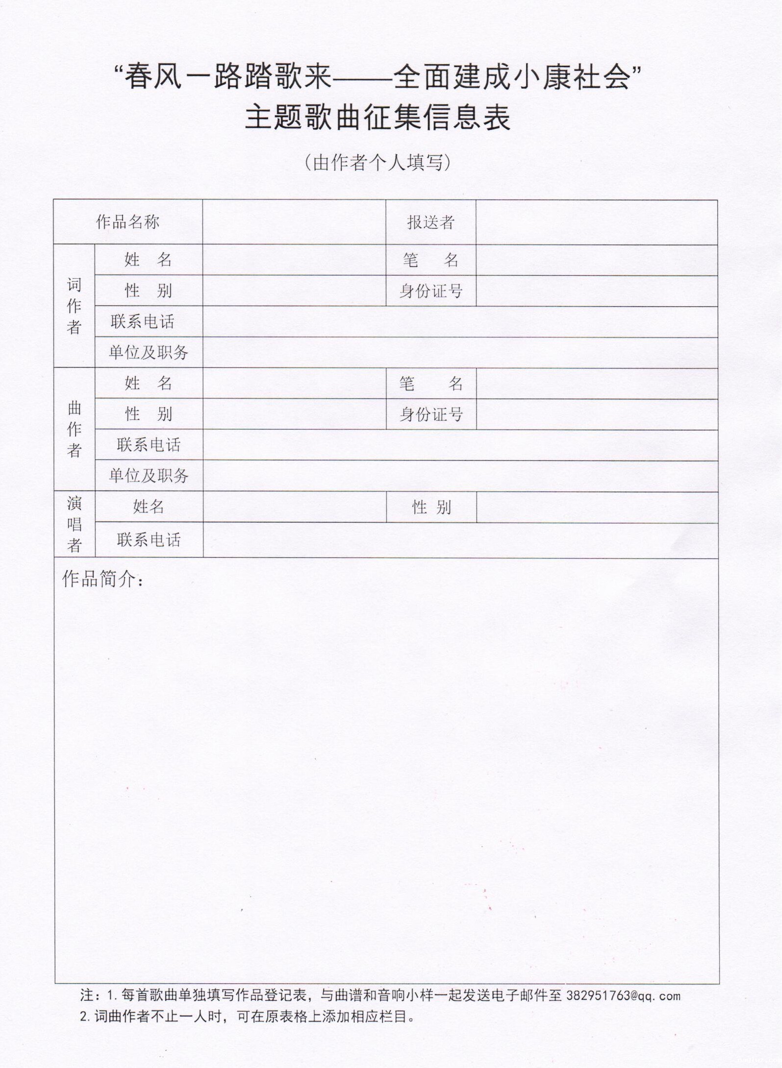 说明:“春风一路踏歌来——全面建成小康社会”主题歌曲征集活动通知已修改,具体内容以此版本为准。