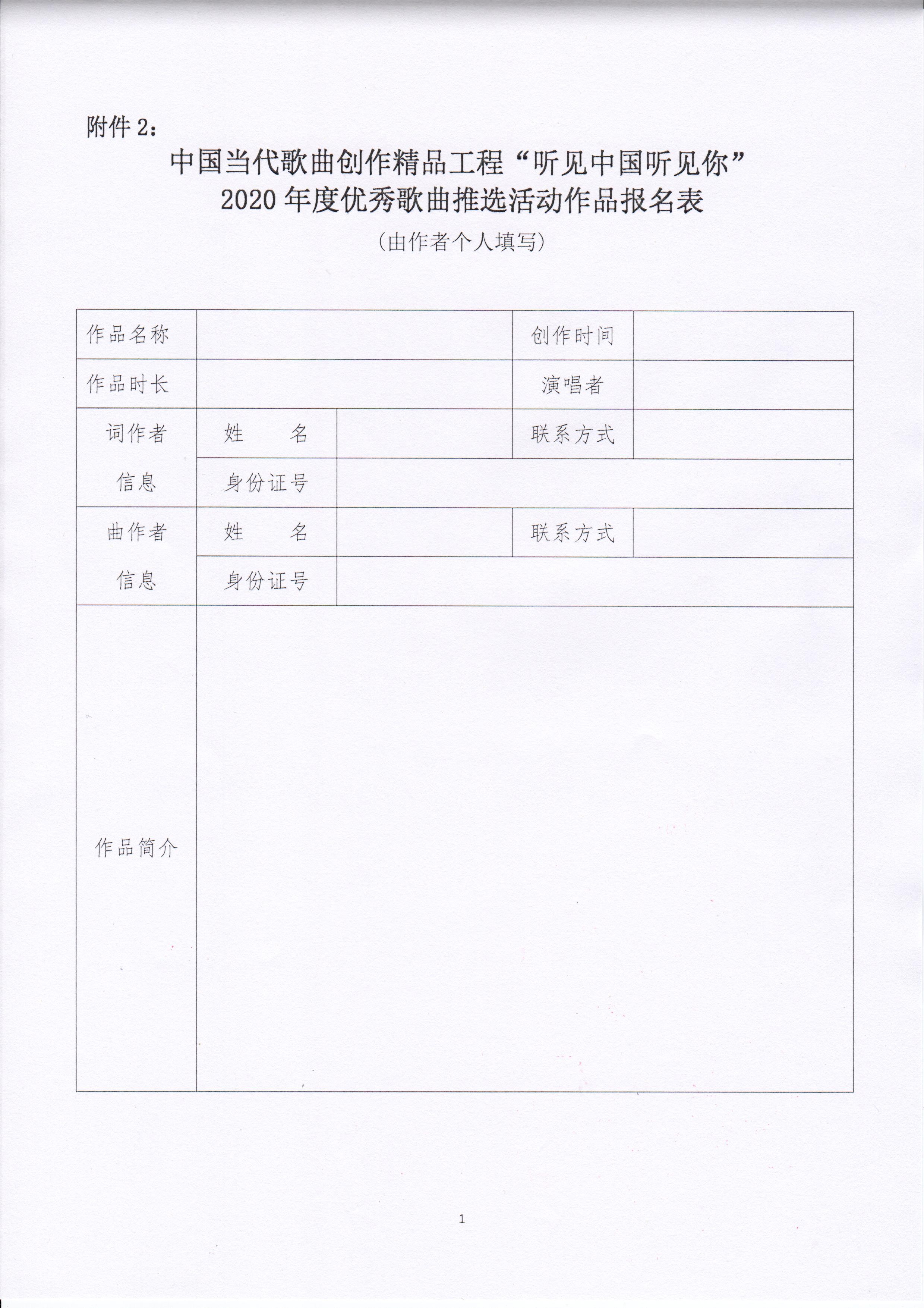 附件:中国当代歌曲创作精品工程“听见中国听见你” 2020年度优秀歌曲推选活动作品报名表