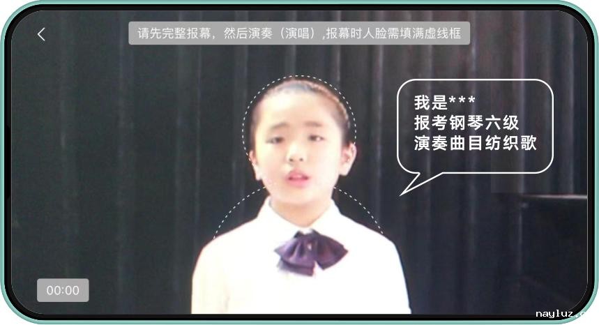 6)、报幕要求:每条视频均需要报幕。考生在开始演奏(演唱)前,必须正面朝摄像手机或平板智能终端,报幕时需要将人脸完整填充拍摄界面的人形框,以便实现电脑人脸识别,清晰报出本人姓名、专业、级别和曲目名称后,开始演奏(演唱)录制。