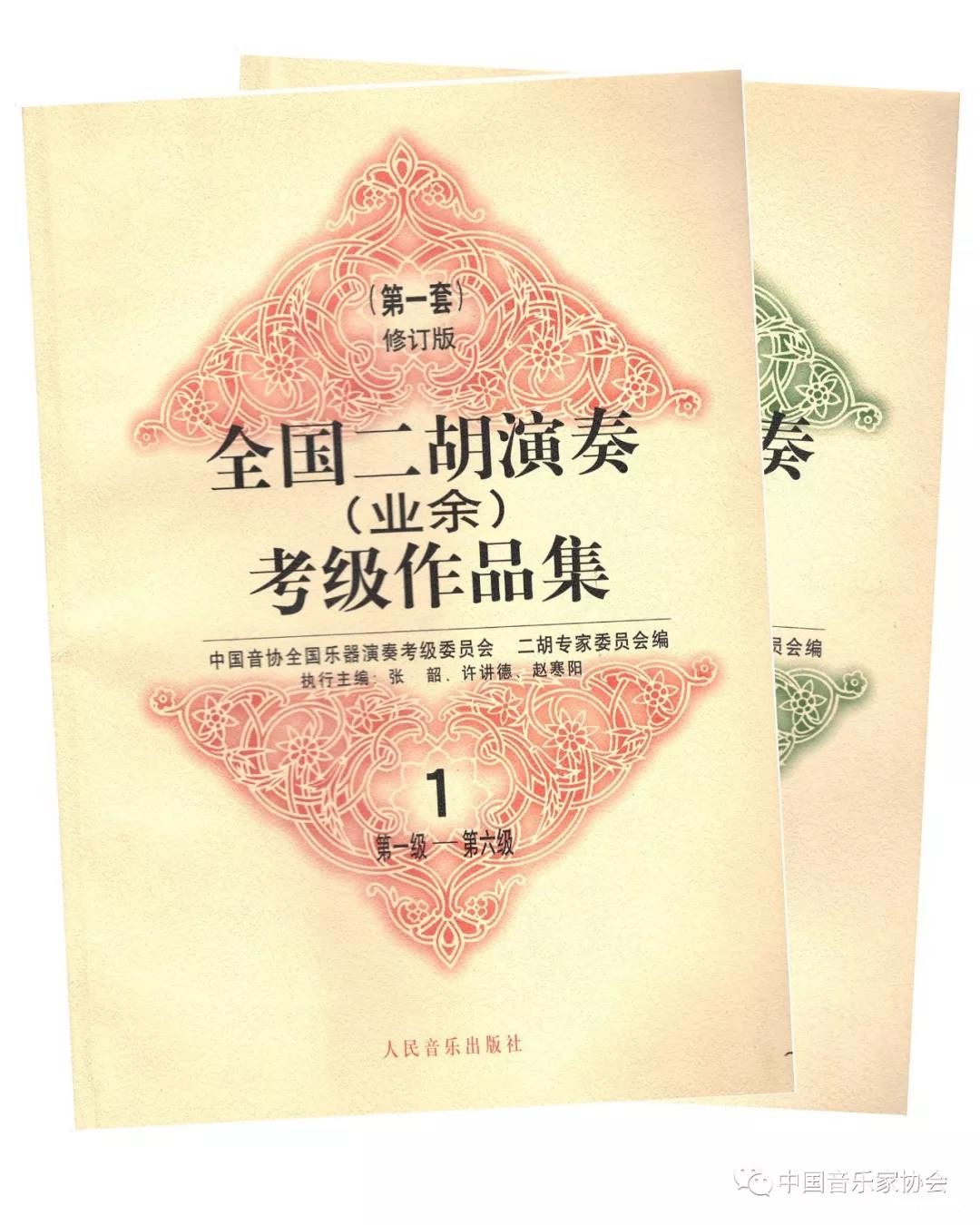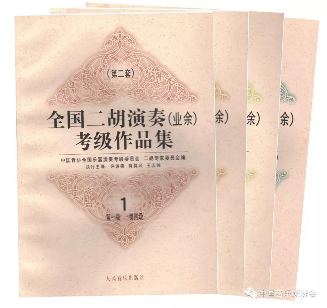 中国《全国二胡演奏(业余)考级作品集》第一套、第二套、第三套及第四套,均可在考级中使用。考生既可选用某一套作品集的某一个级别应试,也可以在这四套作品集同一级别的曲目中交叉选用应试。
