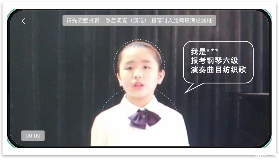 6)报幕要求:每条视频均需要报幕。考生在开始演奏(演唱)前,必须正面朝摄像手机或平板智能终端,报幕时需要将人脸完整填充拍摄界面的人形框,以便实现电脑人脸识别,清晰报出本人姓名、专业、级别和曲目名称后,开始演奏(演唱)录制。