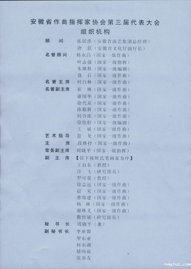 6月21日安徽作曲家协会第三次(换届)代表大会在合肥隆重举行,来自全省各地作曲界的近 百名同仁参加了会议,出席会议的还有省委宣传部李明处长、省文化厅主管部门刘全玉处长、省民政厅民间组织管理局夏惠芬处长、著名黄梅戏音乐作曲家时白林先 生及省音协主席盘龙、副主席、秘书长谢林义等省音协主席团的部分成员。
