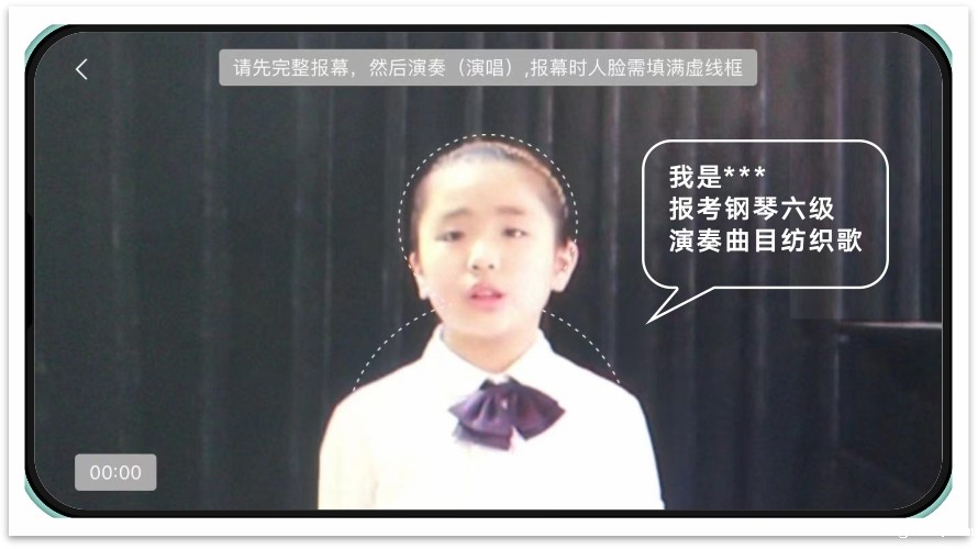 6)报幕要求:每条视频均需要报幕。考生在开始演奏(演唱)前,必须正面朝摄像手机或平板智能终端,报幕时需要将人脸完整填充拍摄界面的人形框,以便实现电脑人脸识别,清晰报出本人姓名、专业、级别和曲目名称后,开始演奏(演唱)录制。