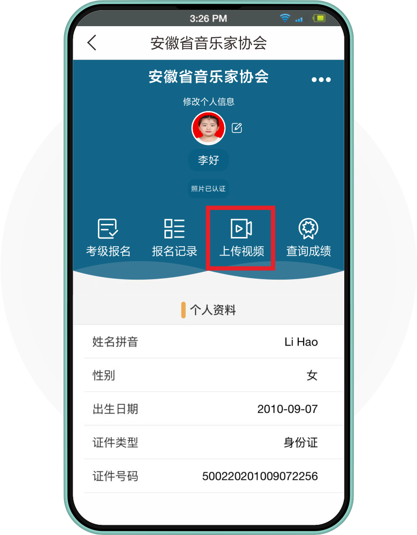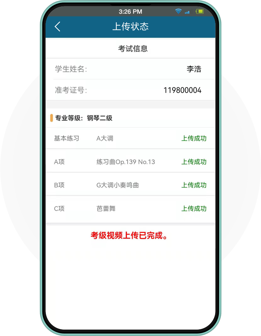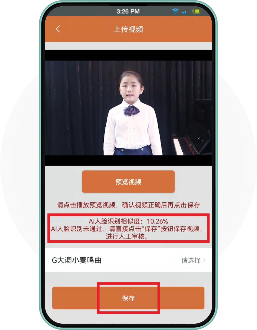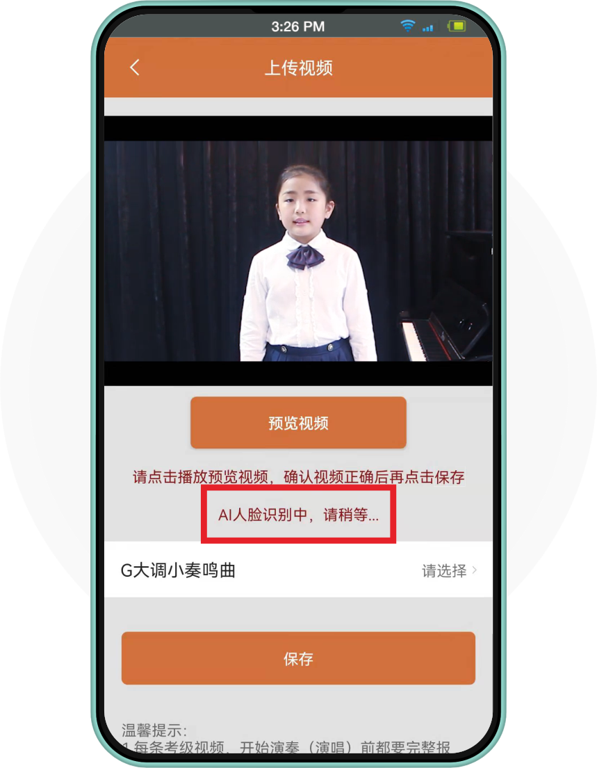 点击“开始”按钮,考生正面朝摄像手机报幕,需要将人脸完整填充拍摄界面的人形框,以便实现电脑人脸识别,清晰报出本人姓名、专业、级别后,开始演奏曲目。