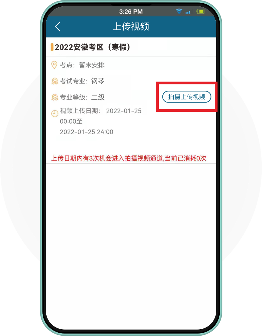 在视频上传的时间范围内,手机登录系统后,在考区首页点击“上传视频”,进入上传视频的界面;点击报考的考次右侧的“拍摄上传视频”按钮,进入拍摄上传视频界面。