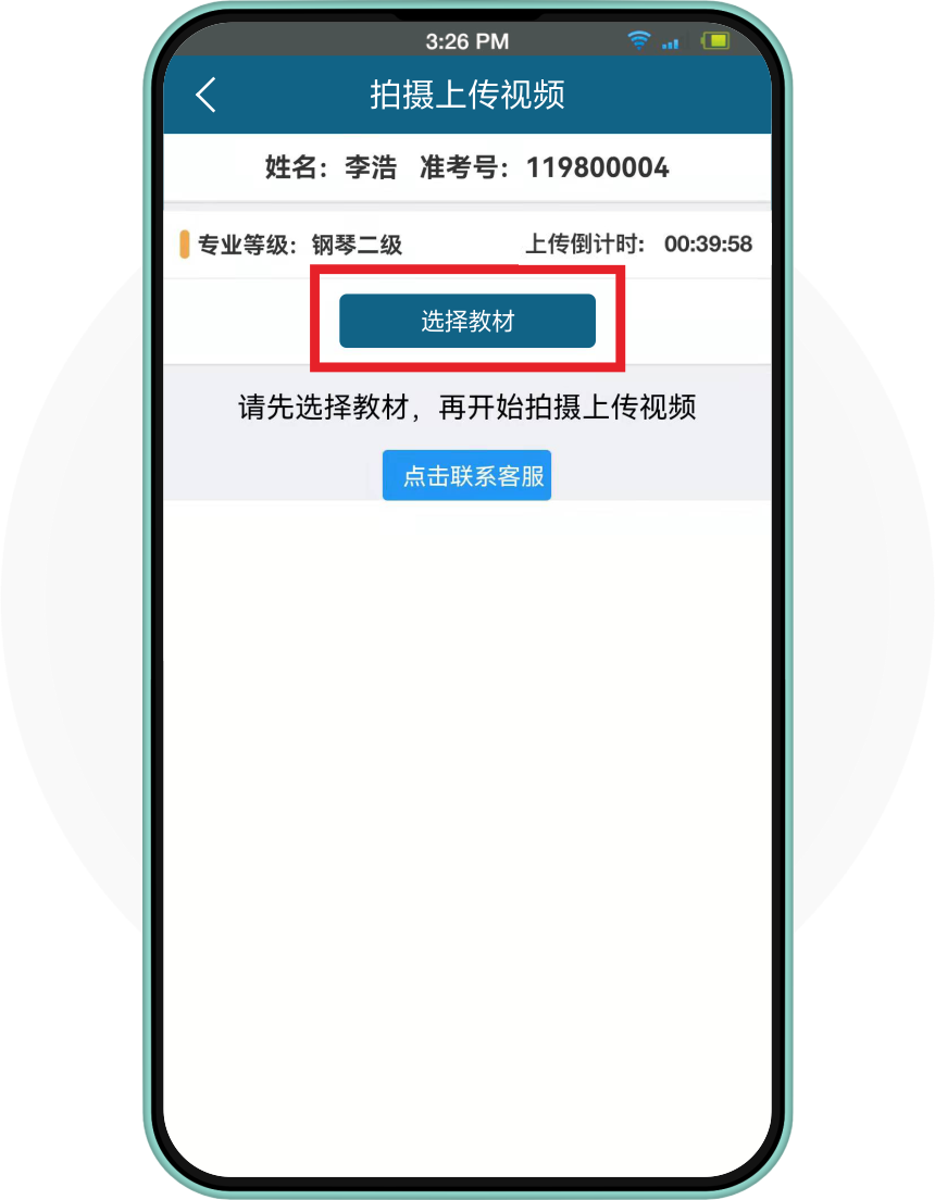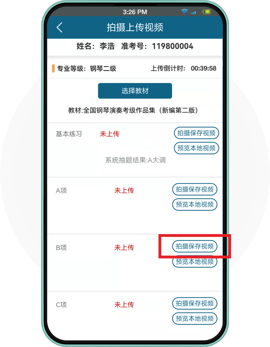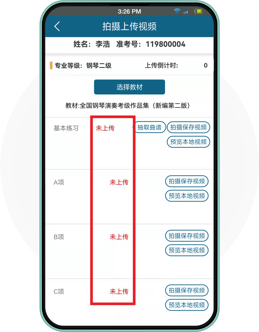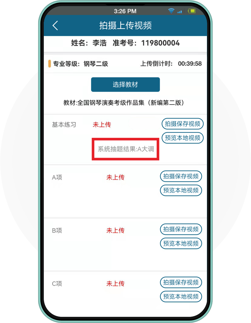 在拍摄上传视频前,先选择教材,如果报考的专业有基本练习或者视奏,请根据系统的提示先抽取曲谱,再开始拍摄上传视频。进入拍摄上传视频界面,系统将会开始上传倒计时,请在规定时间内完成所有项目的拍摄上传。