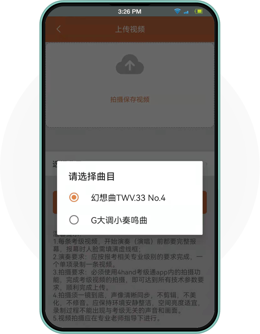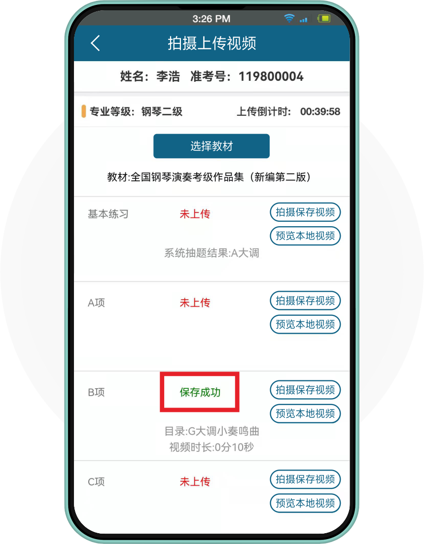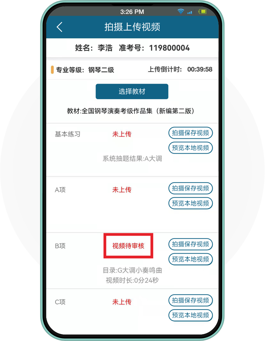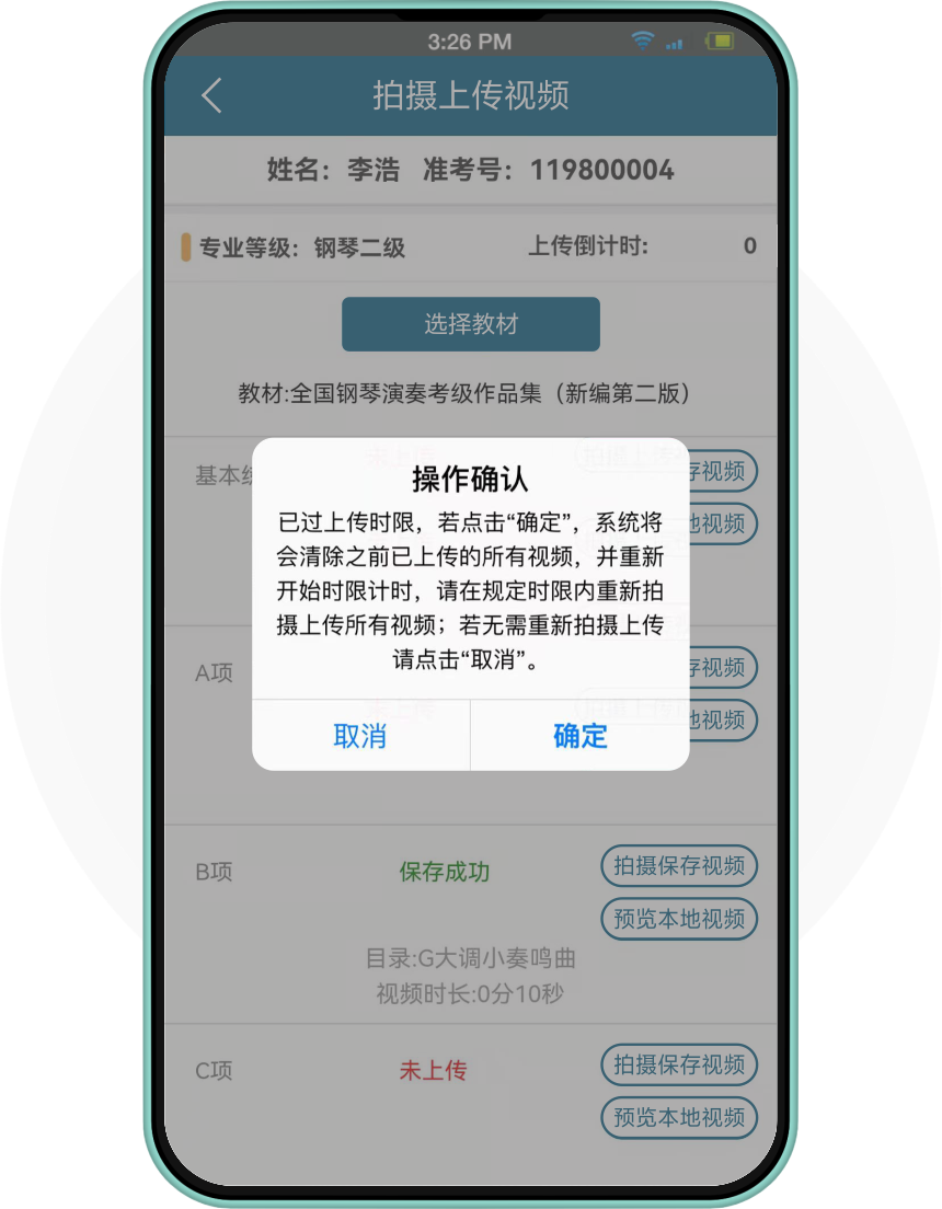 在拍摄上传视频前,先选择教材,如果报考的专业有基本练习或者视奏,请根据系统的提示先抽取曲谱,再开始拍摄上传视频。进入拍摄上传视频界面,系统将会开始上传倒计时,请在规定时间内完成所有项目的拍摄上传。