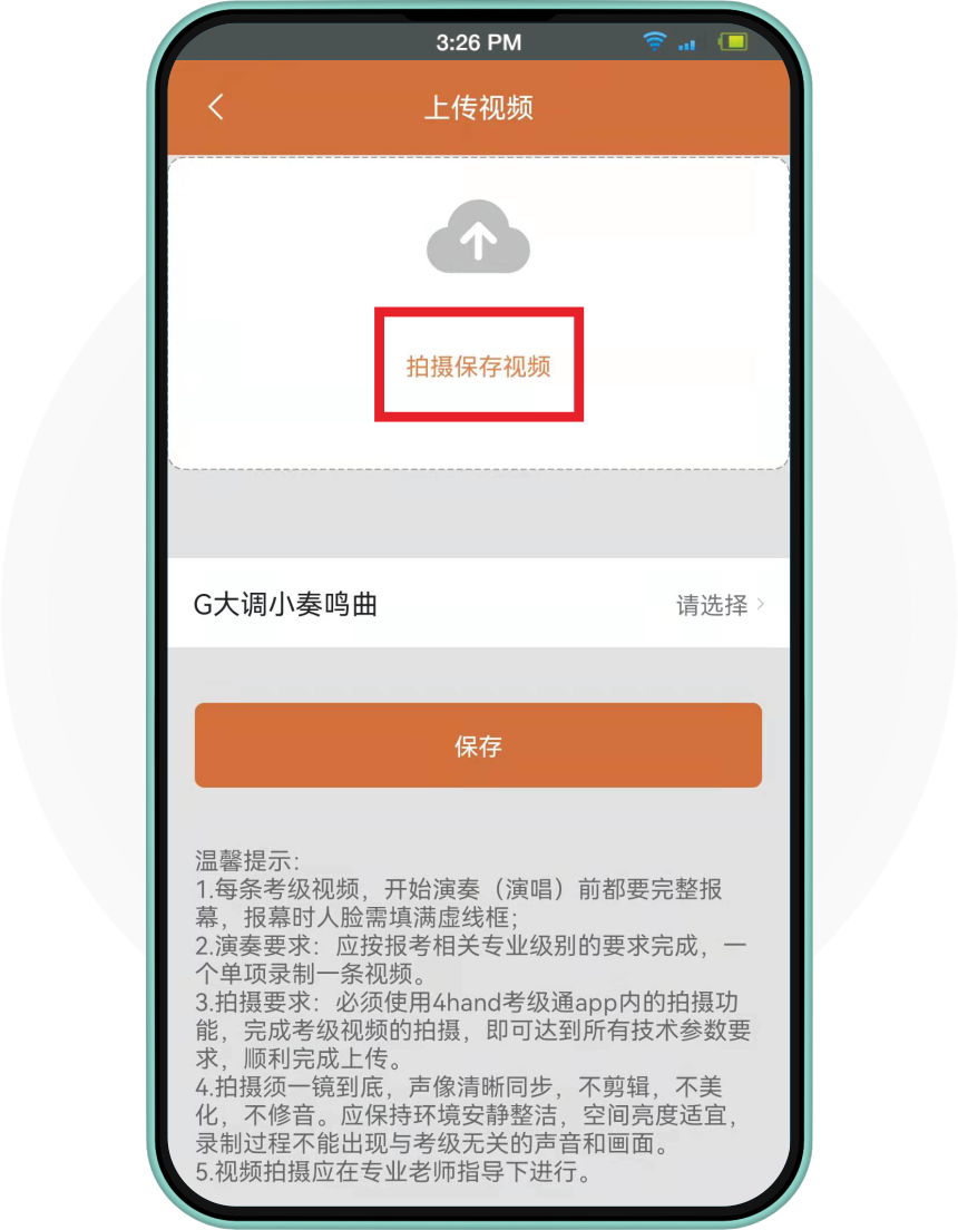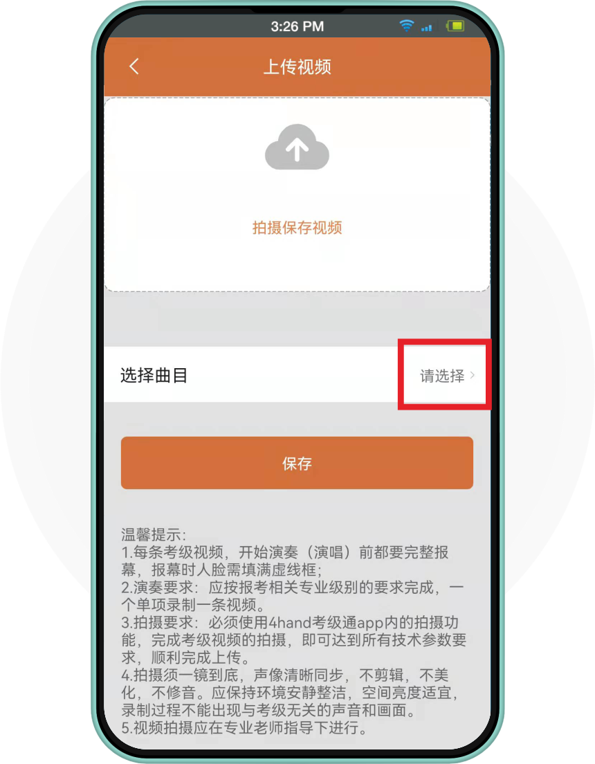 点击现在要拍摄上传项目的“拍摄保存视频”按钮,进入拍摄保存界面,先选择曲目,再开始视频拍摄。