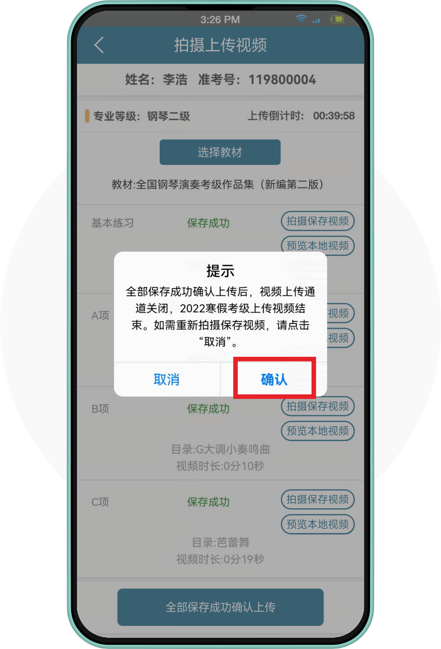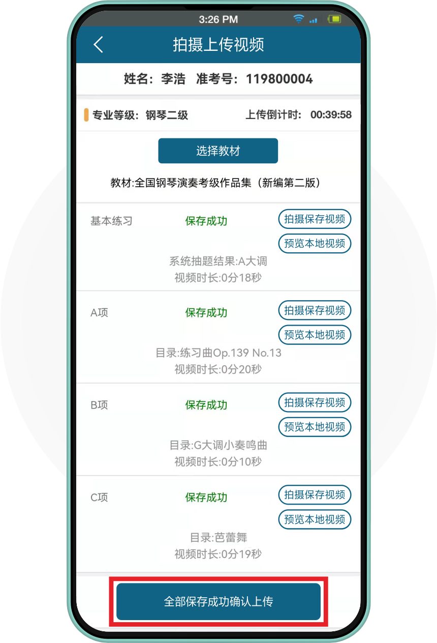 当所有项目都显示为“保存成功”的状态,点击下方的“全部保存成功确认上传”按钮后即代表本次考级视频拍摄录制上传结束,在规定时间内不能再次拍摄录制上传视频,请谨慎操作!!!!