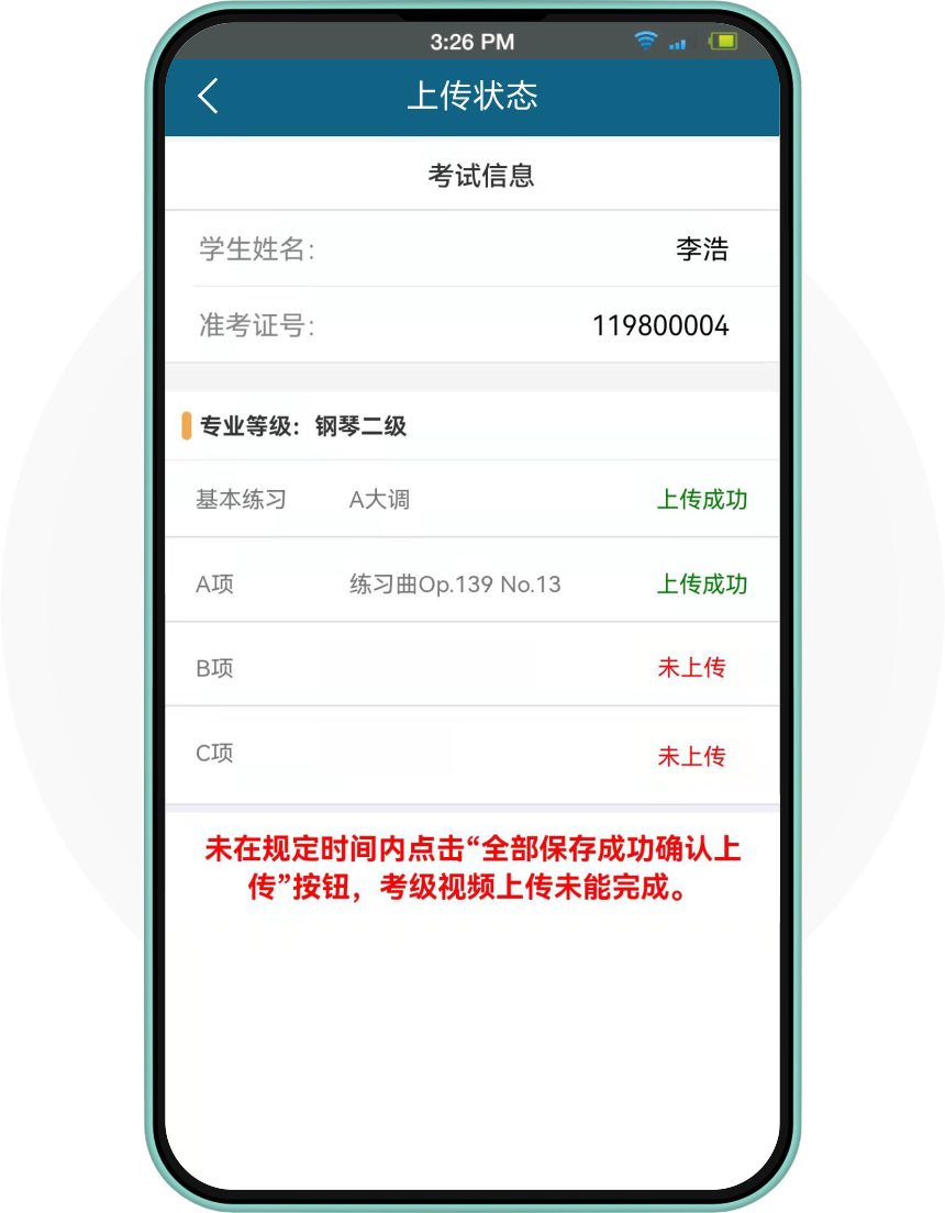 考生在规定时限内,没有完成所有考级项目视频的拍摄并保存,也没有点击“全部保存成功确认上传”按钮,进行确认。最后状态将显示为“考级视频上传未能完成”。
