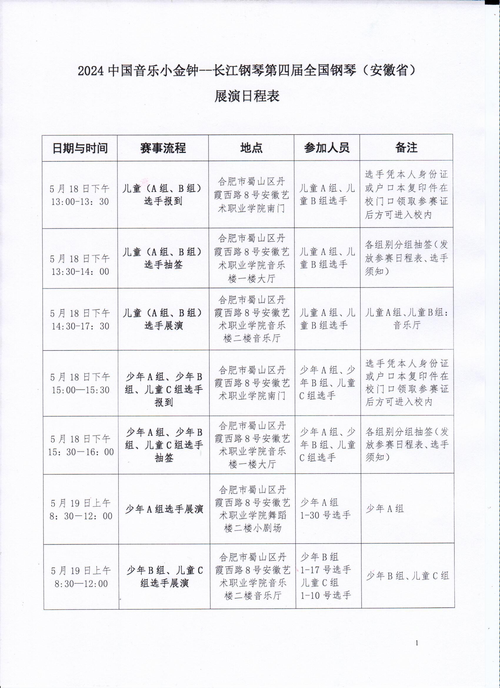 2024中国音乐小金钟——长江钢琴第四届全国钢琴展演安徽省选拔赛业余组第二轮现场选拔定于2024年5月18日—19日举办。经过第一轮评选,现公布钢琴现场选拔赛入围选手名单及比赛日程安排。
