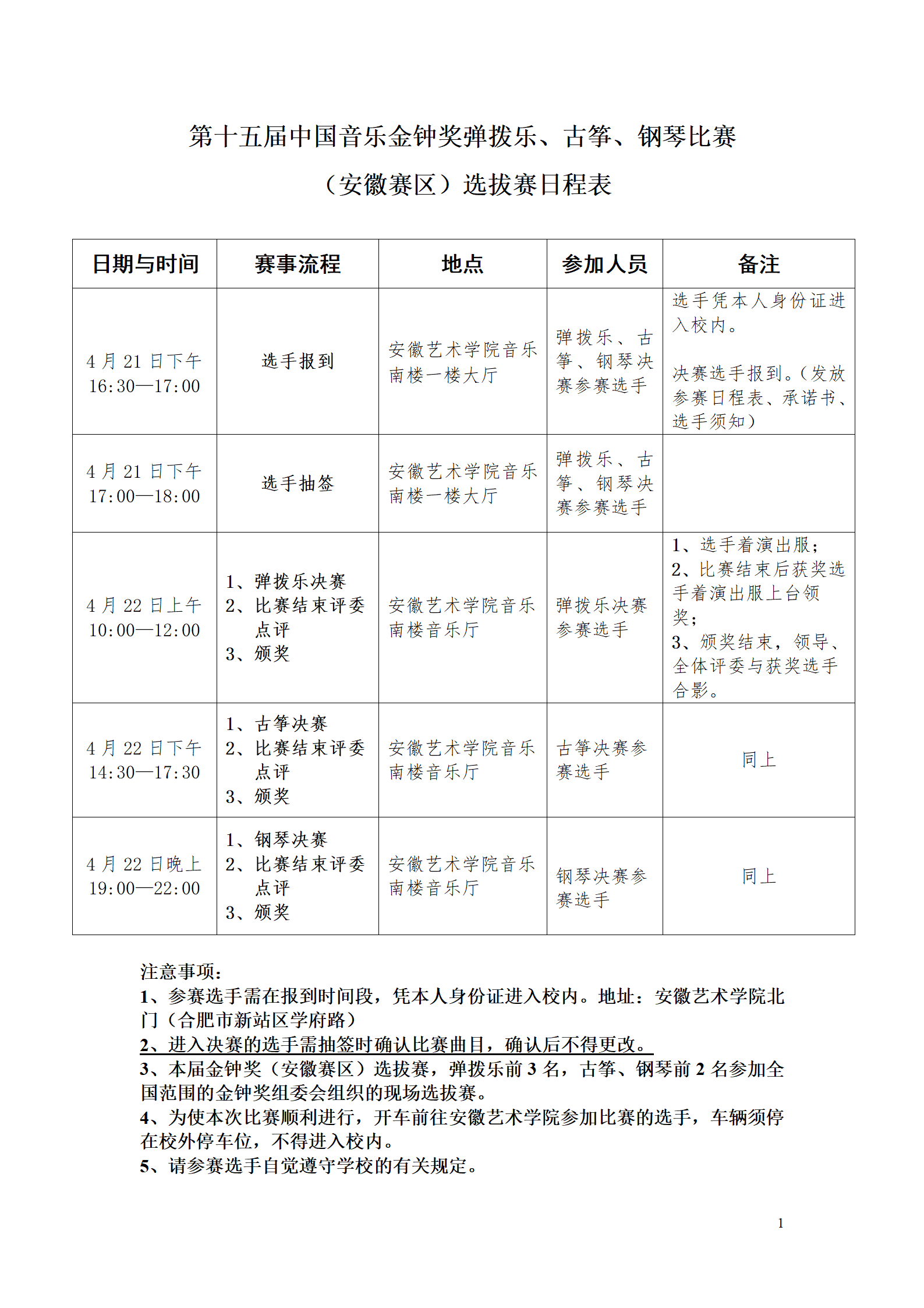 注:决赛如有参赛选手放弃比赛资格,则由候补选手依次递补。选手弃权须本人以书面形式向主办方说明情况,无故弃赛者将取消其下届金钟奖安徽赛区选拔赛的报名资格。